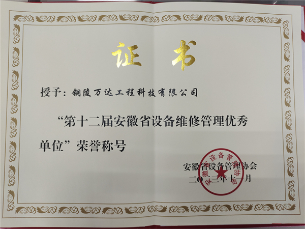 “第十二屆安徽省設(shè)備維修管理優(yōu)秀單位”榮譽稱號